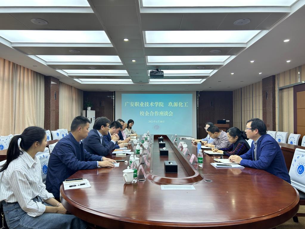 4月10日下午,广安玖源化工有限公司总经理何希甫一行3人来校与公司开展校企合作洽谈,广安经开区党工委委员、副主任张学秋,广安市经济和信息化局总经济师唐刚及相关科室负责人,公司党委委员、副董事长袁驰及相关部门负责人参加了座谈会。