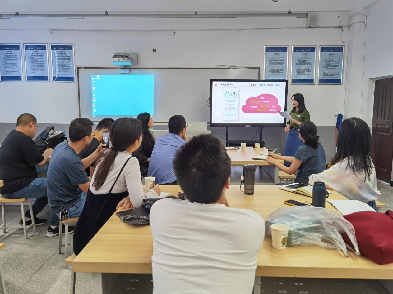 会上李金娟针对教学实施报告重点从选题、教学设计、教学实施、教学反思、现场答辩等角度讲述了她们团队成员孜孜以求、攻坚克难的备赛历程。赵婧羽则生动地为大家重现了比赛现场的教学展示环节,并给出了如何使教学设计出彩的一些建议。